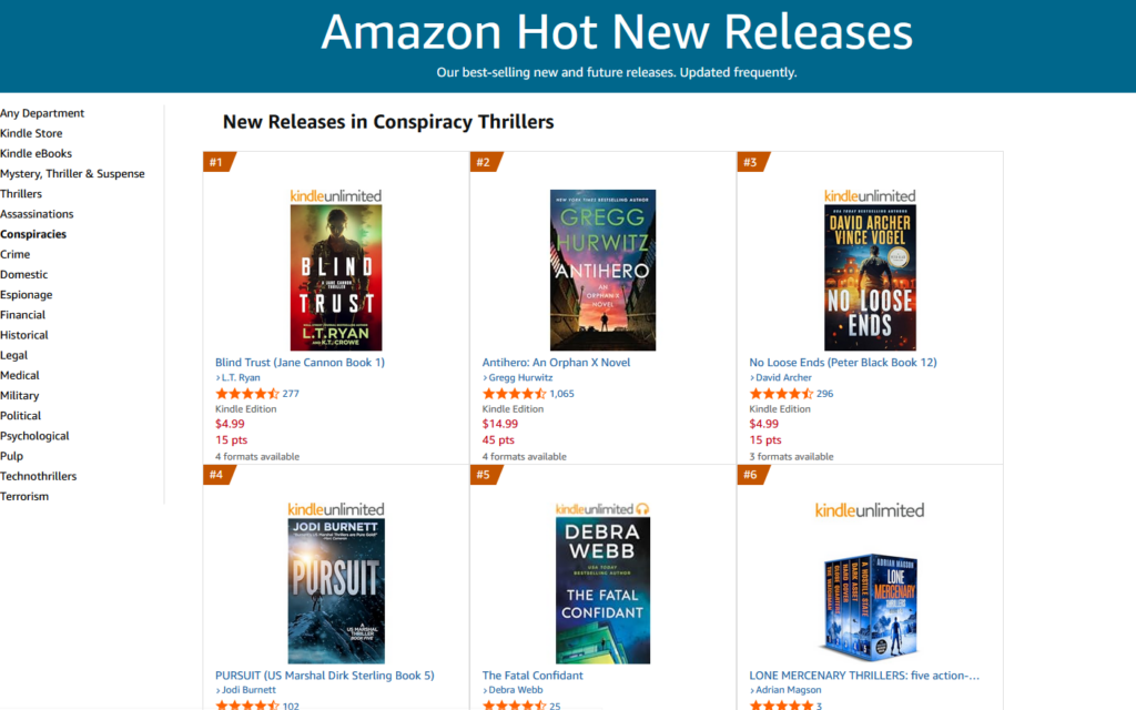 In the meantime, I’m working on my next Jane Cannon book. Because yes, I also write as K.T. Crowe with the esteemed L.T. Ryan. BLIND TRUST has performed well above my own expectations, though is probably par for the course for L.T. But it’s back to FBI agents and mysteries for me for a while. Also, look at this from yesterday! #1 in Conspiracy Thrillers, and right next to Greg Hurwitz’s Orphan X series, of which I’m a huge fan!
